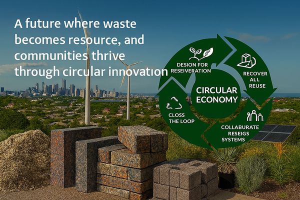 To lead Australia’s transition to a circular economy by transforming waste into high-performance materials. We harness innovation, resource recovery, and regenerative design to reduce landfill, lower carbon emissions, and create scalable solutions that close the loop on waste.